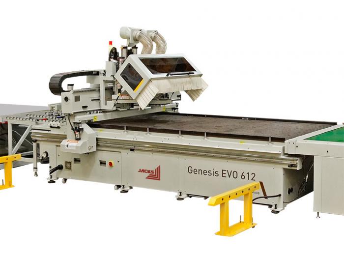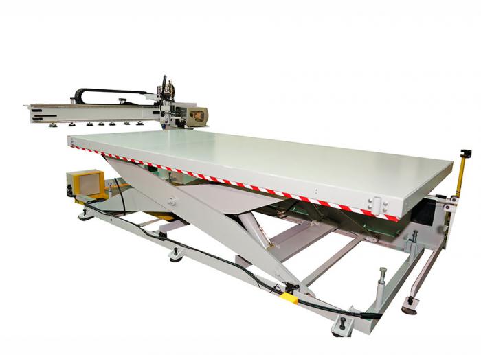 In addition to automatically labelling, handling systems around the CNC include a scissor lifting table, a pusher and an off-loading conveyor table, all with dust extraction.