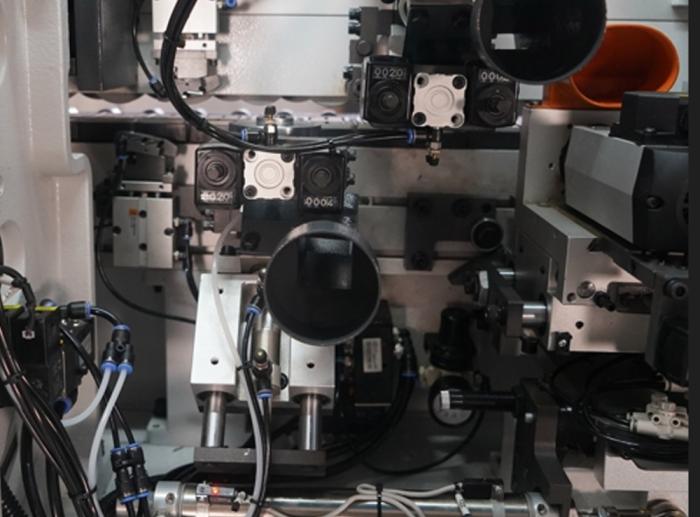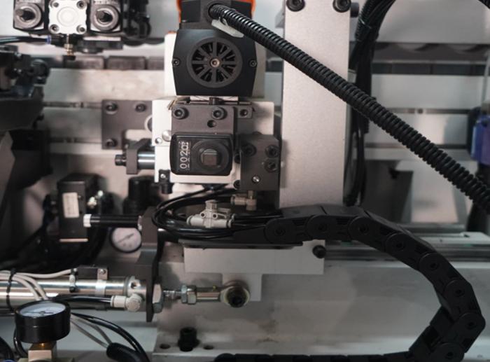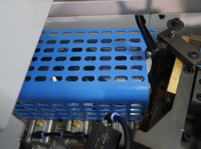 KDT infeed guides and rollers are mounted on 10mm steel plates. 3 pneumatic pressure rollers ensure the tape is firmly pressed against the workpiece.
