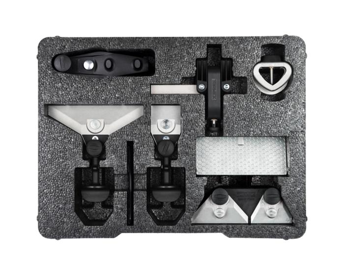 The kit also includes the KJ-140 Wide Centering Knife Jig. The wider clamp stabilizes the long and flexible blades of filleting knives, for example. This gives you an even bevel and angle along the entire blade, even on knives with flexible blades that are otherwise difficult to sharpen uniformly.